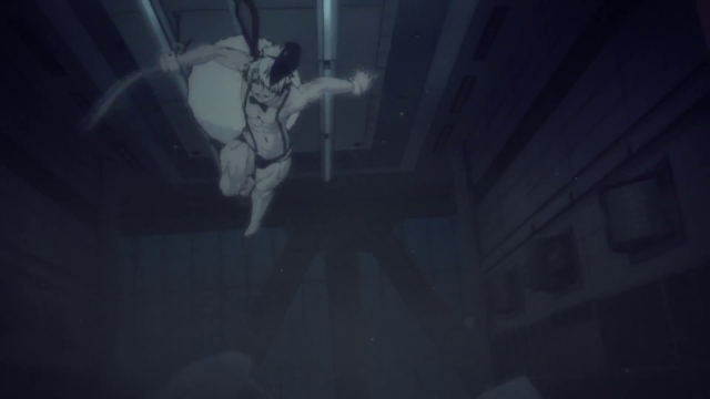Usagi was a young man with a fit build, he has messy white short hair which covered his left eye while his right eye is red with a black sclera. He is also shown to have sharp teeth. He wore a black rabbit-eared headpiece with one of the ears drooping over his left eye. He wears a collar with a black bow on his neck. Two black suspenders hooked across his shoulders supported his extremely tight and revealing black shorts. He also wore a large white rabbit tail on his back. His shoes were a pair of black dagger high heels.